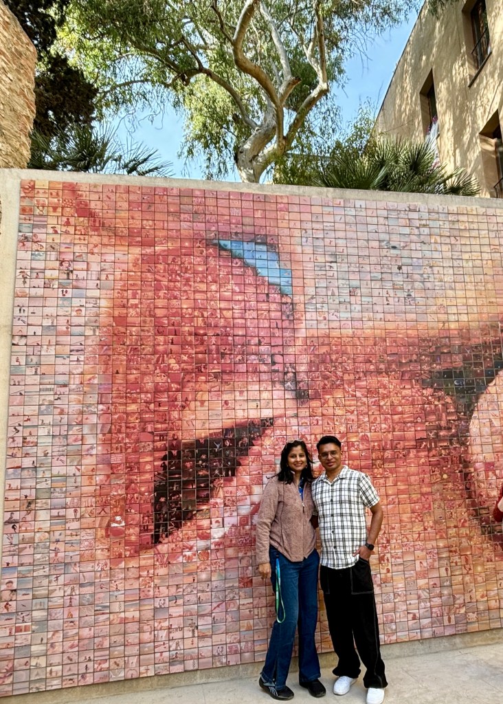 There was no time to rest. At 4 p.m., we had a GuruWalk booked—a free walking tour with a local guide. I was running on fumes, dragging my feet more than walking, but I’m so glad we went. Our guide led us through the Gothic Quarter, the oldest part of the city, where Barcelona was born. Before diving into the Gothic alleys and Gaudí wonders, we made a quick stop at one of Barcelona’s most heartwarming hidden gems—the Kissing Wall (El Muro del Beso). At first glance, it looks like a romantic mosaic of two people kissing. But step closer, and you’ll see it’s made up of thousands of tiny photos, each capturing moments of freedom, love, and everyday life.