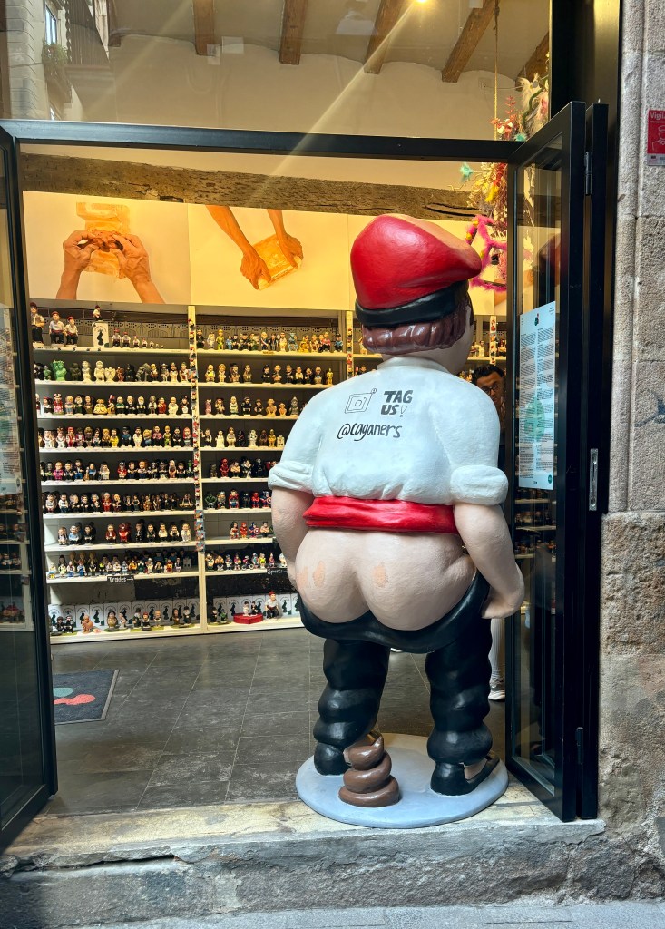 Just when we thought we were getting a grip on the city’s ancient charm, we stumbled upon something… unexpected. Tucked into a souvenir shop window was a tiny figurine of a man squatting with his pants down. Meet the Caganer—a traditional Catalan Christmas figure that’s been raising eyebrows (and chuckles) for centuries.