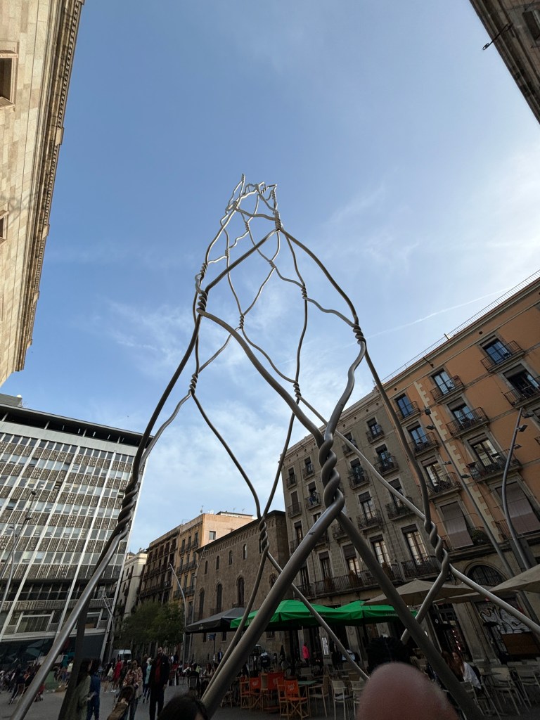 Just a few steps away, in Plaça de Sant Miquel, we came across something that stopped us in our tracks—a towering sculpture made entirely of wire, frozen in a moment of breathtaking balance. This was the Monument als Castellers, a tribute to one of Catalonia’s most awe-inspiring traditions: human towers, or castells.
