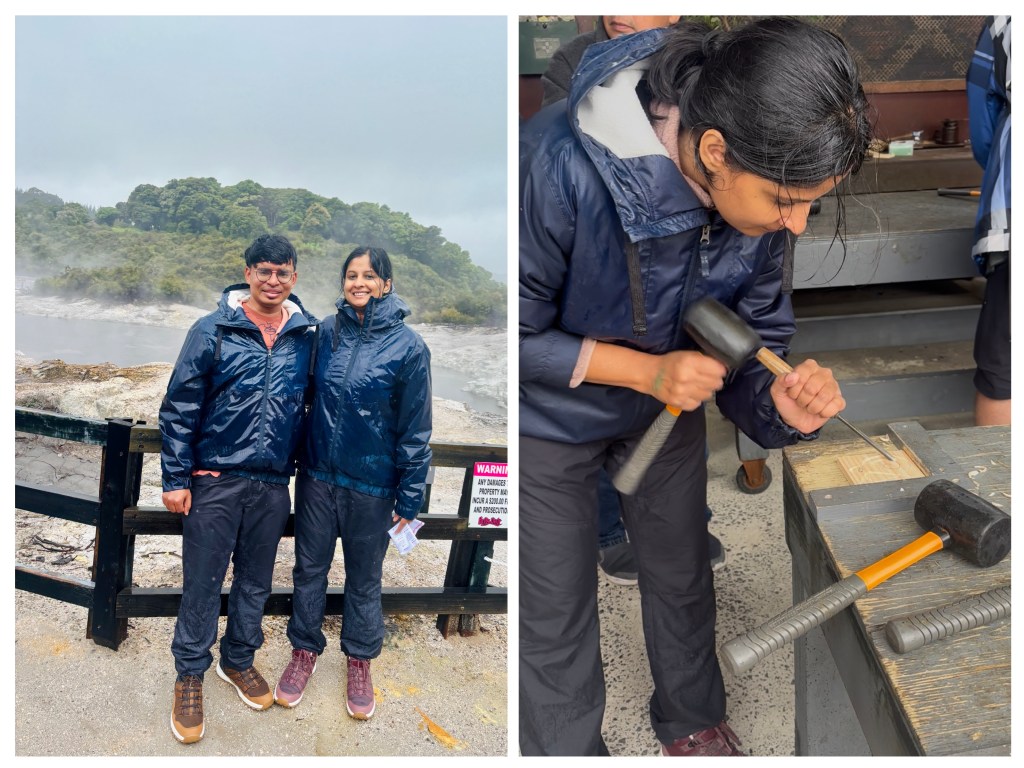 Next stop: Hell’s Gate Geothermal Reserve, a volcano tour, where steaming geothermal features reminded us of the raw energy bubbling beneath New Zealand’s serene surface. And then it was time for the sulphur mud bath—therapeutic, earthy, and hilarious… especially because Harshit slipped, true to tradition. Honestly, I’m convinced a trip isn’t officially complete until Harshit has at least one dramatic tumble. We get to carve on wood in the thermal reserve.