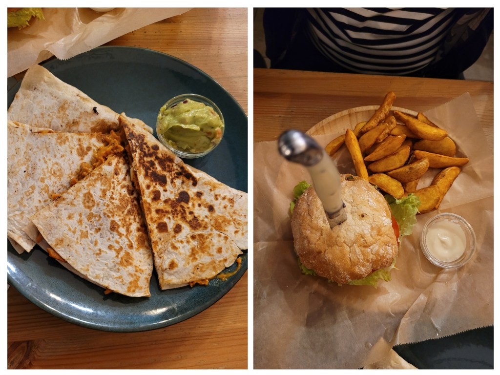 Hunger eventually pulled us away, and we chose a restaurant with outdoor seating, hoping for a leisurely Spanish lunch. We waited about 10–15 minutes before our food arrived: a vegan Spanish-style skew and a burger. The skewer was decent, but the burger turned out to be the worst we’d ever tasted—dry, bland, and utterly forgettable. We laughed it off, deciding it would be remembered not for its flavor but for the story it added to our trip.