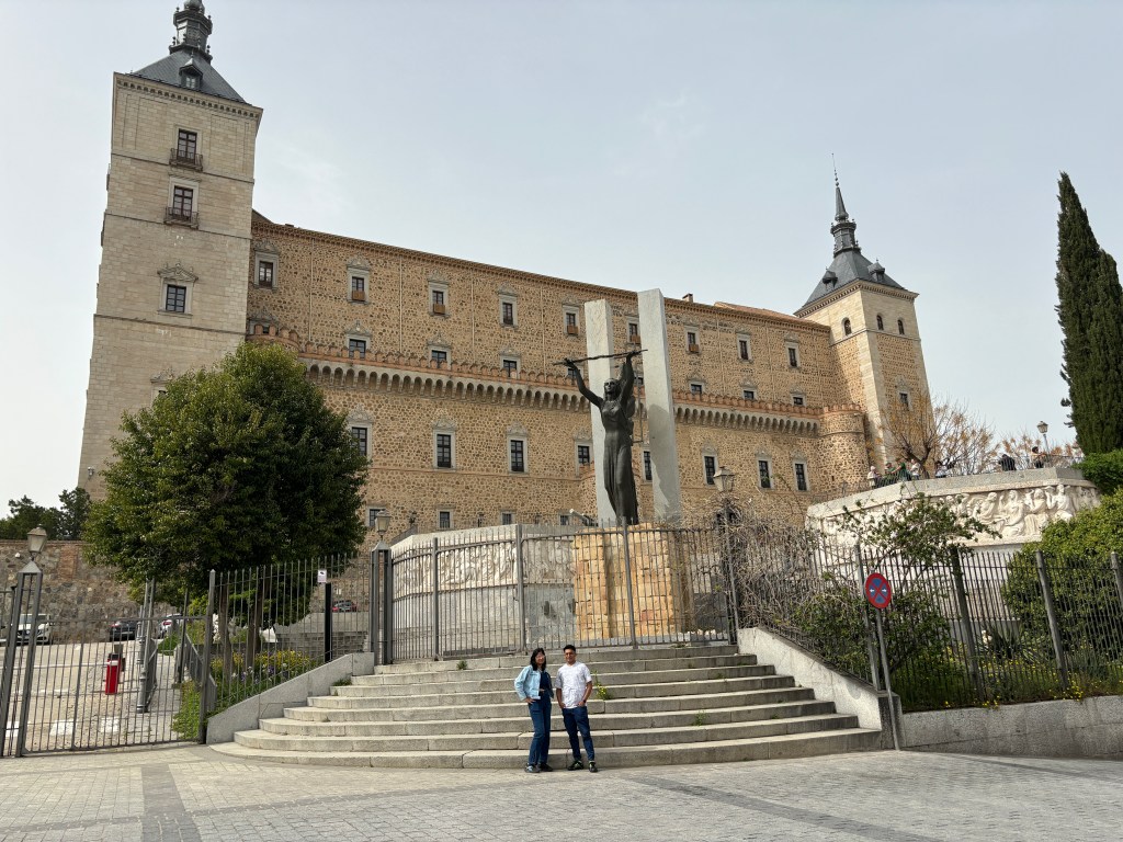 From there, we made our way to the Alcázar of Toledo, its fortress towers rising with an authority that felt unshakable. The stone walls carried the weight of battles, resilience, and reinvention. In front of it, a solemn monument stood—a statue holding a cross-like structure, stark against the backdrop of the fortress. It was a reminder that Toledo’s story is not just one of beauty, but of endurance, faith, and strength carved into stone.