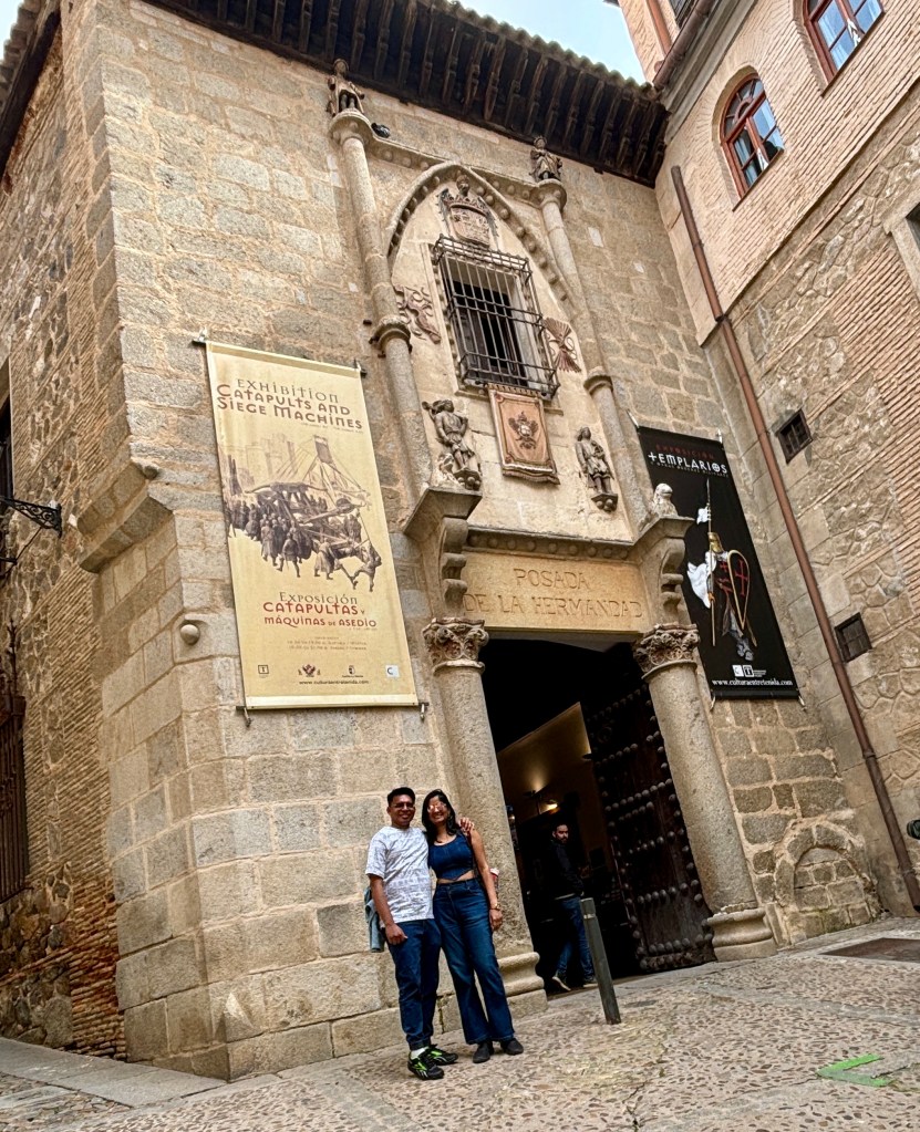 Before heading deeper into the city, we stopped at the Posada de la Hermandad, a medieval building whose stone façade seemed to carry centuries of stories. Once the headquarters of a brotherhood, today it hosts exhibitions that bring Toledo’s past vividly to life—swords, catapults, and relics of medieval warfare displayed alongside banners honoring figures like King Fernando III. Standing before its carved stone entrance, with heraldic shields and ornate detailing above the arch, felt like stepping into a portal where civic duty, faith, and history intertwined.